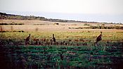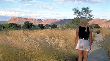 Aber das Regengebiet im roten Zentrum hatte auch Vorteile. Erstens war es kühler und somit waren auch längere Ausflüge zu Fuß möglich. So sah ich in der Schlucht der Ormiston Gorge, einem der schönsten Abschnitte der MacDonnell Ranges, mehr Kängurus als jemals zuvor und danach. Und zweitens blühten um mich herum alle Blumen und Gräser, die im Zusammenspiel mit der Sonne und der roten Erde ein faszinierendes Farbenspiel erzeugten.