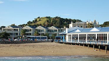 Leider nähert sich unsere Reise nun langsam dem Ende. Ein wenig wehmütig nehme ich Abschied von Paihia, dem Standort der letzten Tage, der mir so gut gefallen hat. Es geht nach Auckland zurück. Unterwegs besichtigen wir in Kawakawa einige Werke des Künstlers Friedensreich Hundertwasser, der die letzten Jahre bis zu seinem Tod hier gelebt hat. Bemerkenswert sind die von ihm gestalteten öffentlichen Toiletten. Die gefallen mir ausgesprochen gut - so könnte ich mir mein Bad zu Hause auch vorstellen. Gegen Mittag sind wir wieder in Auckland. Auf der Nordinsel haben wir ca. 2150 km zurückgelegt. Nachmittags bleibt noch viel Zeit für individuelle Entdeckungen. Ich fahre mit der Fähre zum auf der anderen Seite des Hafens gelegenen idyllischen Ort Devonport, der sich so viel ruhiger präsentiert als die pulsierende Metropole Auckland. Hier gibt es einen schönen Aussichtspunkt, den Mount Victoria, von dem aus man einen traumhaften Blick über den ganzen Naturhafen und auf Auckland hat.