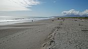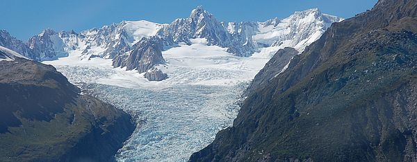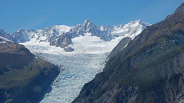 Von Queenstown aus fahren wir zur Westküste und überqueren dabei den Kamm der Südalpen. Gegen Mittag genießen wir die Einsamkeit am Haast Beach, wo auch unsere Muschelsammler fündig werden. Weiter geht es zum Fox Gletscher, dessen Ursprung in den Südalpen mit über 3000 m hohen Bergen liegt. Auf einer Wanderung kommen wir nahe an die Gletscherzunge im Tal heran. Dann kommt ein Höhepunkt meiner Neuseelandreise: Ich entschließe mich zum Helikopterflug über die Gletscher mit Landung auf dem Gletscher. Zuerst fliegen wir den Franz Josef Gletscher hoch. Über den Wolken ist der Himmel tiefblau. Wir landen auf dem Gletscher. Ich bin total begeistert. Was für ein Panorama! Auf dem Rückflug geht es den Fox Gletscher hinunter.