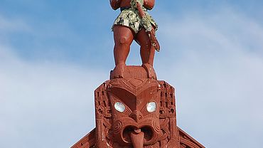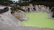 Von der Desert Road am Rande des Nationalparks genießen wir noch einmal die Aussicht auf die Vulkangipfel. Am Lake Taupo vorbei geht es Richtung Rotorua, das Zentrum geothermaler Aktivitäten und auch der Maori-Kultur. Wir besuchen das Wai-O-Tapu Thermalwunderland, wo ein schön angelegter Rundweg an dampfenden Höhlen und Kratern, blubbernden und farbigen Teichen, heißen Quellen und kleinen Wasserfällen vorbeiführt mit klangvollen Namen wie Champagne Pool, Inferno Crater oder Devil’s Bath. Auch im Touristenort Rotorua liegt Schwefelgeruch in der Luft und an vielen Stellen steigt heißer Dampf aus dem Boden. Authentische Maori-Kultur sehen wir in Ohinemutu, einem Stadtteil Rotoruas, mit den typischen Schnitzereien und einem Maori-Versammlungshaus.