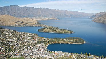 Von Te Anau geht es nach Queenstown, der Adrenalin-Hauptstadt der Welt. Hier kann man ganz viele abenteuerliche Dinge machen. Zuerst steuern wir die Kawarau Bungy Bridge an, denn einer von uns ist wild entschlossen, den Sprung 43 m in die Tiefe zu wagen. Es herrscht Hochbetrieb. Das Besucherzentrum dort ist sehr professionell und es gibt schöne Aussichtsplattformen, damit man die Sprünge gut verfolgen kann. Das Panorama mit Brücke, Schlucht und Fluss mit fast türkisblauem Wasser ist sehenswert. Am Nachmittag haben wir Gelegenheit, durch das nette Städtchen Queenstown zu bummeln mit schönen Shops, Cafés, Parkanlagen und einer kleinen Waterfront am Lake Wakatipu. Auf einen Berg kann man mit der Seilbahn fahren, die Talstation ist vom Stadtzentrum aus zu Fuß leicht zu erreichen. Das mache ich dann auch und genieße von oben die grandiose Aussicht auf die Stadt, den See und die umgebenden Bergketten.
